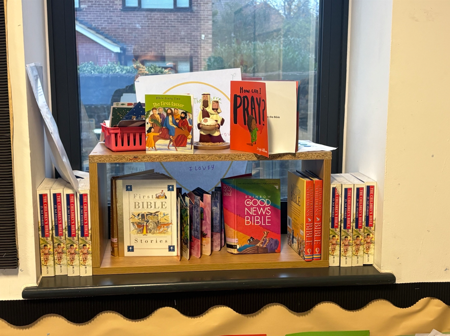Our classroom has a prayer space. This is a calm and quiet area where children can read the Bible, have reflection time or write a prayer to God. Our 'Bible Stories' display has some great paintings made based on the miracle of Jesus walking on water - something they really enjoyed learning about!
