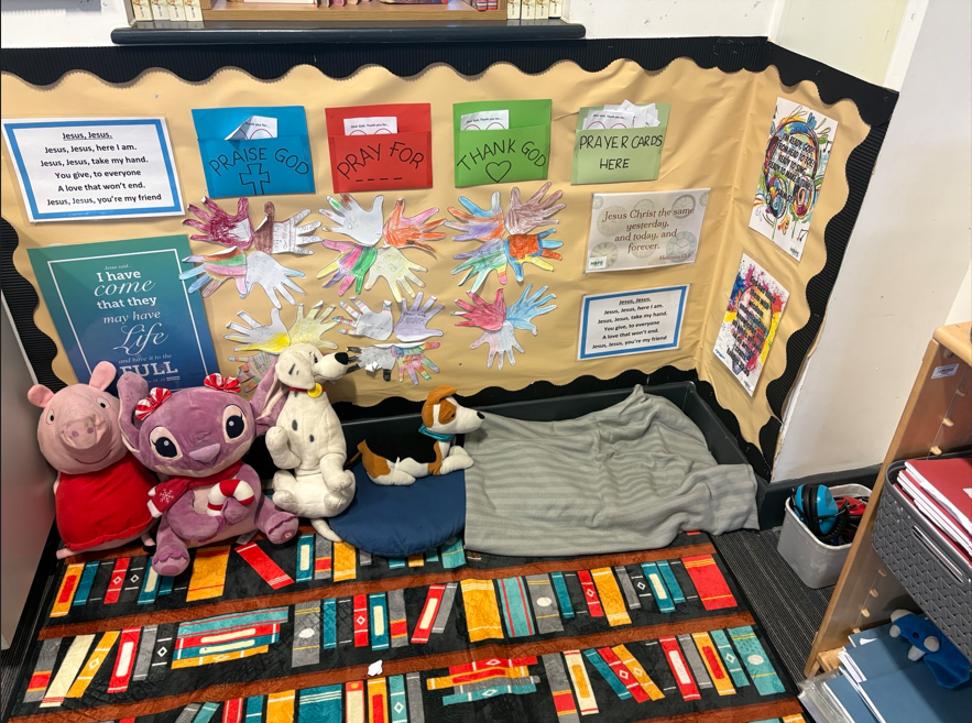 Our classroom has a prayer space. This is a calm and quiet area where children can read the Bible, have reflection time or write a prayer to God. Our 'Bible Stories' display has some great paintings made based on the miracle of Jesus walking on water - something they really enjoyed learning about!